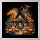Poster avec une illustration cool et éffrayante d'une maison hantée en bois. Entouré de grands citrouilles oranges et d'arbres aux feuilles oranges. Les fenêtres oranges ajoutent une belle lueur. Amusant design Halloween.