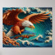 Un aigle majestueux avec ses ailes écartées de larges sanglots triomphalement au-dessus du puissant, un aigle majestueux avec ses ailes écartées de larges sangs triomphalement au-dessus du puissant, bien que le milieu d'une vague dans l'océan comme un souffre, capturant un poisson en toute sécurité dans ses talons aiguisés, alors que la lumière chaude des casquettes blancs illumine la scène, en soulignant les textures complexes et le mouvement dynamique les vagues de l'océan, sur cette texture sculptée en bois.