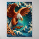 Un aigle majestueux avec ses ailes écartées de larges sanglots triomphalement au-dessus du puissant, un aigle majestueux avec ses ailes écartées de larges sangs triomphalement au-dessus du puissant, bien que le milieu d'une vague dans l'océan comme un souffre, capturant un poisson en toute sécurité dans ses talons aiguisés, alors que la lumière chaude des casquettes blancs illumine la scène, en soulignant les textures complexes et le mouvement dynamique les vagues de l'océan, sur cette texture sculptée en bois.