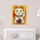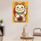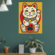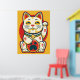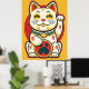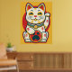 Cette illustration éclatante présente un Maneki Neko japonais traditionnel, ou "Chat chanceux", représenté dans un style charmant et fantaisiste. Le chat est montré assis debout, soulevant sa patte gauche dans un geste d'accueil qui est censé apporter la chance et le bonheur. Le chat a une expression délicieuse et joyeuse, avec ses yeux larges et sa bouche courbée dans un sourire doux. Le Maneki Neko est principalement blanc avec des taches de jaune et de rouge, ajoutant une touche de gaieté et de coloris au design. Il porte un collier vert orné d'une cloche en or, symbolisant richesse et prospérité. Le chat tient une grande pièce rouge avec des empreintes de pattes noirs, en soulignant son rôle de porte-bonheur et de bonne fortune. L'arrière - plan présente un cercle rouge audacieux, rehaussant l'apparence brillante et joyeuse du chat. Le design d'ensemble a une texture rétro, légèrement en détresse, lui donnant une sensation nostalgique et intemporelle.