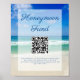 Une belle photo de vagues océaniques décore cette affiche moderne de fonds de lune de miel pour mariage de destination. Jolie écriture cursive bleue sur la photographie tropicale au bord de la mer pour votre panneau de mariage à la plage.