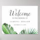 Cette affiche mariage sauvage de palme tropicale d'accueil est parfaite pour un mariage sur la plage ou à destination. Le design comprend un éventail exotique de feuilles de bananiers d'aquarelle verte, fougères, feuillage, plantes botaniques et verdure pour une sensation tropicale estivale. Customisez l'affiche avec le nom de la mariée et du marié, et la date du mariage.