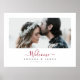 Ce modèle simple, chic, mariage photo d'accueil affiche un look moderne et épuré dans un format horizontal. Nous avons donné à ce design minimaliste un éclat de panache avec "Welcome" dans une police moderne fluide qui parvient à être à la fois élégant et amusant. Nous aimons l'arc gracieux du 'W' ainsi que l'épanouissement stylisé et allongé aux deux extrémités du mot. Pour souligner cet aspect du design, nous avons choisi la bordeaux pour la partie "Welcome" dans notre exemple, ce qui en fait un très bon choix pour un mariage de automne ! Mais ne laissez pas cela vous empêcher d'expérimenter avec différentes couleurs pour le "Welcome" ou tout autre texte dans ce design, d'ailleurs. Nous avons choisi le noir pour vos noms en-dessous, et un ton gris pour votre date en bas. Customisez ce poster avec votre photo préférée et faites-le le vôtre ! Vous pouvez facilement éditer le texte aussi bien que pour votre goût, et vous pouvez changer la police et la couleur du texte aussi bien. Par exemple, vous pouvez remplacer "Bienvenue" par une autre salutation de votre choix, ou vous pouvez choisir de supprimer les détails de la date en faveur d'un autre message ou d'un espace vide où se trouve cette ligne de texte, si vous préférez. Vous pouvez également activer le filtre noir et blanc si vous voulez voir comment votre photo couleur ressemblerait en noir et blanc. Et si vous préférez ne pas utiliser de photo, vous pouvez utiliser votre illustration préférée, etc. à la place d'une photo. Avant d'envisager de changer la couleur du texte "Bienvenue", veuillez consulter notre sélection de différentes couleurs que nous avons déjà faites pour vous, comme vous pourriez trouver de l'inspiration là-bas, et peut-être même votre couleur parfaite! Et si vous pensez que vous pourriez préférer un look similaire dans un format vertical, nous avons aussi fait une sélection d'affiches de bienvenue mariages dans ce style avec un look très similaire à celles-ci, avec des différences intéressantes dans le placement du texte et le texte inclus. Une affiche comme celle-ci permet d'ajouter facilement des arrangements floraux, etc. sur un ou les deux côtés de votre journée spéciale pour lui donner votre propre look qui reflète votre style et le thème de votre mariage. Et bien sûr, vous pouvez l'utiliser simplement comme il est, pour une expression simple et élégante de vos sentiments.