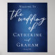 De belles nuances profondes de bleu foncé créent une texture comme de l'eau sur ce poster de bienvenue mariage du soir. Parfait décor au bord du lac ou au bord de l'eau pour une cérémonie au bord du lac avec vue sur l'eau. Elégant script blanc minimaliste avec vos détails sur un dégradé qui donne l'impression de nager sous l'eau.