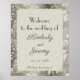 Un signe de bienvenue mariage design pour ceux qui préfèrent un look vintage et épuré. Votre texte customisé est imprimé sur un bloc central déchiqueté, avec un arrière - plan floral en étain vintage. Les polices de style vintage ont été choisies pour compléter le look, mais peuvent être facilement changées.