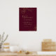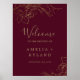 Cette affiche d'accueil mariage dorée et fleurie bordeaux est parfaite pour un mariage élégant. Le design boho moderne présente un arrangement fantaisiste de faux feuilles d'or dessiné à la main, de feuilles et de botaniques sur un arrière - plan crème. Customisez l'affiche avec le nom de la mariée et du marié, et la date du mariage. Remarque : Ce design ne comporte pas de véritable feuille d'or. C'est un graphisme de haute qualité fait pour ressembler à du papier doré.