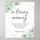 Affiche de mariage en mémoire aimante Eucalyptus verdure. Comprend des feuilles d'eucalyptus aquarelle et un cadre géométrique doré. Le mot 'en mémoire aimante' n'est pas modifiable.