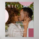Un panneau de bienvenue de mariage moderne présente une photo pleine et une grande typographie de bienvenue sur une superposition noire avec un design géométrique monochromatique bordeaux et rose.