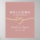 Élégant, moderne, affiche de bienvenue de mariage rose poussiéreux minimaliste avec cœur de corde en faux or et écriture calligraphique manuscrite simple.