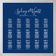 Carré, affiche en bleu marine avec modèles en texte blanc. Bleu clair, foncé avec les grands noms de la mariée et du marié en haut dans un script moderne écrit à la main. La date est imprimée sous les noms. Ce modèle peut accueillir jusqu'à quinze tables avec huit convives assises à chacune. Customisez selon les besoins pour votre événement en supprimant des tables et / ou en raccourcissant les listes de noms. Le texte du numéro de tableau est en script plus audacieux, avec des noms listés sous la police imprimée. Vous pouvez modifier la taille de l'affiche - celle-ci est de 24 pouces de carré.