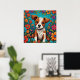 Adorable art de l'air blanc avec un chien chiot brun et blanc entouré de fleurs d'art populaire en rose, orange et violet.