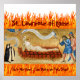 "Rendez-moi," dit-il à ses bourreaux. "J'ai fini de ce côté-ci !" Connu surtout pour son sens de l’humour, Saint-Laurent de Rome (IIIe siècle) est l’un des martyrs les plus célèbres de la Ville Éternelle. Nous aimons penser qu'il serait amusé par notre coordination "Grilling (ou Cuisine) avec" produits! + Dans cette splendide peinture de c. 1430 de l'artiste vénitien Jacobello del Fiore, Saint-Laurent est représenté torréfié à mort. La disparité dans la taille des figures principales est une caractéristique de l'art qui n'utilise pas de perspective. Plus la figure est grande, plus la personne représentée dans la composition est importante, Dieu le Père étant une exception ici. Le Saint-Laurent, qui est exposé au gridiron, domine cette scène. Élevant son torse supérieur sur ses coudes et les mains pliées dans la prière, le Saint regarde vers Dieu avec une expression sereine sur son visage. Comme c'était la coutume dans l'art de la pré-Renaissance, Dieu le Père n'est pas représenté comme une figure humaine complète, mais seulement comme une tête émergeant des nuages dans le coin supérieur gauche de l'image où seule la Main de Dieu aurait figuré symboliquement dans les âges précédents. À droite du panneau, les bourreaux de Saint-Laurent, de taille et d’importance relative pour lui, s’attaquent au feu sous le gridiron avec des râteaux à longue manche, celui qui se trouve devant pour protéger son visage de la chaleur des flammes. A gauche, il y a deux religieuses agenouillées, des religieuses qui ont soit commandé le panneau elles-mêmes comme objet de dévotion privée, soit commandé le panneau au nom de leur couvent dans le cadre d'une oeuvre d'art plus grande comme une prédella. Ce sont les plus petites figures de toutes. Les éléments secondaires comprennent deux parchemins avec des inscriptions latines, l'un dans l'espace au-dessus du Saint-Laurent et l'autre autour des religieuses. + Saint-Laurent est le saint patron des comédiens et des cuisiniers. + Fête : 10 août + Crédit photo (M 022) : Martyre du Saint-Laurent, avec deux soeurs, de Jacobello del Fiore (Italien vénitien ; 1370-1439), peinture de tempe sur panneau de bois dans le style gothique international, 27,7"x14,9" (70,5 cm x (8 cm), Rijksmuseum, Amsterdam, The Pays-Bas, Acc. N° SK-A-4001. Les religieuses ont été identifiées de diverses manières comme Dominicaines ou Bénédictines. Source : Wikimedia Commons {{PD-Art|PD-old-100}}. Le fichier image a été identifié comme étant exempt de restrictions connues en vertu de la loi sur le droit d'auteur, y compris tous les droits connexes et voisins. + Crédit d'image (Flamme Border) : Extension/Adaptation de Fire Border Clip Art (Digital Flames of Fire) par Diane Hudson, PublicDomainPictures.net, CC0 1.0 Universal (CC0 1.0) Public Domain Dedication.