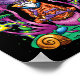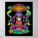 L'image représente une scène psychédélique avec une figure centrale d'un homme sage méditant en position de lotus. Il est entouré d'un florilège de champignons colorés, dont un grand chapiteau en forme de parapluie qui domine sa tête. Des flammes de différentes couleurs dansent autour des champignons, créant une atmosphère mystique et autre.