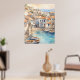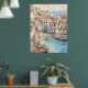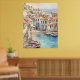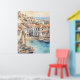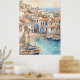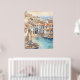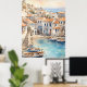 Capture the beauty of a Mediterranean coastal village at sunset with this watercolor wall art. Golden-orange skies reflecting on turquoise waters, charming streets, flowering plants, and terracotta-roofed houses create a serene and inviting scene.