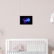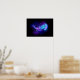 Grande méduse bleue dessinée artistiquement, lumineuse et brillante, avec de longs tentacules sur fond noir avec bioluminescence violette. Méduse lumineuse.