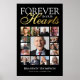 Élégante affiche mémorielle funéraire comportant 15 photos de votre proche disparu, le texte "à jamais dans nos cœurs", son nom et les dates de naissance et de décès.