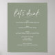 Affiche de Menu de Boisson de Mariage Bohème Vert Sauge Minimaliste. Le texte 'buvons' n'est pas modifiable. Peut être utilisé pour les mariages, les enterrements de vie de jeune fille, les baby showers, etc.