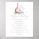 Un charmant menu de dégustation de vin botanique affiche vos sélections de vins surmontées d'une bouteille de vin rosé avec les initiales du couple inscrites, et deux verres à vin sur un lit de feuilles et de feuillage de eucalyptus aquarelle verte. Conçu pour correspondre à notre collection d'invitations Cheers to Love.