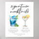 Cette jolie affiche de menu de mocktails signature présente 2 dessins de boissons et leurs ingrédients pour votre bar de mariage ou fête au bord de la piscine. Un Blue Lagoon et un Lemon Drop sans alcool pour un menu de bar tendance avec votre texte d'événement personnalisé.