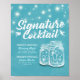 Modèles d'affiche de décoration de mariage de menu de boisson de cocktail de signature - Lettrine élégante et couple vintage Jars Mason et lumières de chaîne sur fond floral bleu clair.