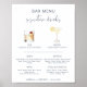 Cette enseigne de menu de bar et de boisson signature présente une police bleue marine manuscrite audacieuse et un design minimaliste moderne. Les illustrations aquarelles sont faites à la main et 15 boissons populaires sont incluses ici dans cette liste. Cliquez sur le bouton 'éditer à l'aide de l'outil de conception' dans la section personnalisation pour voir les boissons qui sont incluses. Chaque boisson est masquée, cliquez donc sur le petit œil à côté de la boisson pour la voir.