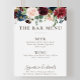 complétez votre événement de mariage rustique avec ce menu de bar de mariage aux fleurs classiques fantaisie. Le design présente de belles fleurs roses, blush, bleues, marine et bordeaux peintes à la main avec des feuilles vertes, soigneusement regroupées en bouquets élégants pour embellir vos cartes d'invitation à l'événement.