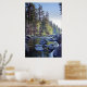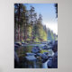 Cette photo montre l'eau lissée de la rivière Merced, les rochers et la pinède, avec El Capitan à distance, dans le parc national Yosemite.