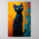 A stylized digital painting of a black cat with piercing yellow eyes, seated against a moody abstract background of teal, blue, and orange. The expressive brushstrokes and shadowy tones evoke mystery and elegance. This piece blends realism with atmosphere, perfect for lovers of feline art and dark aesthetics.