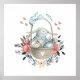 Affiche avec illustration réalisée avec aquarelles. Un lapin lapin mignon portant une robe bleue assis dans un panier entouré de ses oeufs. Des papillons flottent autour de la corbeille décorée d'un bouquet de fleurs soigné.