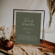 Cette affiche minimale de feuille vert foncé en mémoire affectueuse est parfaite pour un mariage élégant. Le design présente une silhouette de feuille de verdure simple en vert olive avec un style bohème montagnard minimaliste.