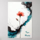 A single, vibrant red poppy blooms against a minimalist white background accented by bold, abstract ink washes in teal and black.
