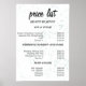 Offrez à votre liste de services une mise à niveau complète et rafraîchissante grâce à cette liste de prix à la menthe ! Ce design allie une élégance minimale et une touche artistique subtile, ce qui en fait un lieu idéal pour les salons qui veulent projeter un look propre, moderne et accueillant. Organisée en sections — Coupe et style, maquillage et cheveux Mariages, et Couleur des cheveux — la disposition garde les choses claires et élégantes avec une typographie gracieuse et un soupçon de texture douce à la menthe dans l'arrière - plan. Parfait pour les professionnels de la beauté qui aiment une ambiance fraîche et polie!