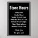 Il y a du texte blanc que vous pouvez remplacer par un message personnalisé et vos heures d'ouverture quotidiennes du dimanche au samedi. Ce panneau d'heures d'ouverture est noir. Le texte est blanc. La bordure sur l'affiche est blanche. Tout le texte peut être modifié ou supprimé. En bas, il y a plus de texte pour un message personnalisé (affiché : Merci de votre visite)