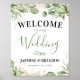 Elégante affiche de mariage d'accueil avec un arrière - plan blanc classique, un élégant feuillage botanique vert luxuriant, des accents dorés et un modèle de texte mariage moderne facile à personnaliser.