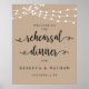 Moderne Rustique, Affiche de Bienvenue pour le Dîner de Répétition de Mariage, en écriture noire, kraft marron, thème de guirlandes lumineuses.