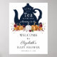 Accueillez vos invités à votre baby shower avec ce magnifique poster, mettant en vedette une théière bleu marine avec des fleurs de Bourgogne colorées et des citrouilles. Ajoutez le nom de l'invité d'honneur, la date de la fête et le texte de bienvenue personnalisé en utilisant les champs fournis.