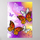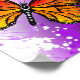 Orange, detailed monarch butterflies on light, purple, picturesque, painted background.