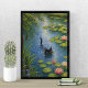 Add a touch of timeless elegance and whimsy to your space with this Monet inspired water lily cat art print. This beautiful impressionist painting features a curious black cat emerging from a tranquil pond filled with lily pads and blooming water lilies, blending classic Claude Monet style with playful modern charm.