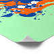 Une affiche design avec design de peinture d'art expressionniste abstraite éclaboussée de couleurs orange et bleu contre un arrière - plan vert menthe. Arty et funky, ce design est coloré et vif.
