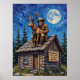Cette peinture fantaisiste présente Bigfoot, une grande créature poilue portant un casquette et un gilet de cowboy, assise sur le toit d'un cabine en rondins rustiques sous une lune pleine et brillante. Il tient doucement un jeune wapiti dans ses genoux. Des arbres à feuillage persistant entourent le cabine, et le ciel nocturne est d'un bleu profond avec des nuages tourbillonnants et des étoiles. Une pancarte en bois attachée au cabine dit : "Bigfoot ne croit pas en vous non plus". L'oeuvre est rendue avec des touches épaisses et texturées, ce qui lui donne une qualité onirique et légèrement surréaliste.