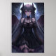 A captivating anime-style portrayal of a gothic succubus or demoness. She features long, flowing silver-grey hair with subtle purple hues, striking purple eyes, and small black horns. Large, dark bat-like wings spread behind her, and she wears an elegant black gothic dress with a corset bodice, off-shoulder sleeves, and a ruffled skirt. A black choker with a purple spiderweb design adorns her neck, and she has intricate lace thigh-high stockings. A luminous full moon casts a soft glow behind her against a dark, cloudy night sky, enhancing her mysterious and powerful aura.