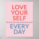 Motivational Love Quote Red And Blue Hearts Pink Poster. Love Yourself Everyday quote in a modern red and blue typography, accented with a string of matching hearts. A simple, feminine pink poster designed to remind you to love yourself every single day.