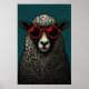 Apportez une touche de sophistication ludique à n'importe quelle pièce avec notre affiche d'art « Mouton bouclé cool ». Cette impression de haute qualité présente un mouton à la laine bouclée portant des lunettes de soleil rondes et audacieuses sur un fond sarcelle riche. Illustré avec minutie avec un travail de ligne tourbillonnant crème et noir, ce design est à la fois de l'art graphique moderne et un charme rétro.