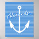Affiche murale de décoration nautique | ancre personnalisable. Idéal pour la chambre d'enfants à thème maritime ou la chambre d'enfant bébé. Ancrage de bateau avec monogramme, citation ou nom. Design à rayures bleu et blanc.