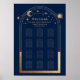 Mystical Chic Blue Gold Sun Moon Stars Astronomy Mariage Seating Chart Mariage Sign Poster Prints présente un cadre doré, lune et étoiles sur un arrière - plan bleu marine foncé. À l'intérieur du cadre est le texte "Welcome" dans l'élégant script de calligraphie dorée et vos informations personnalisées sur le plan des sièges de réception de mariage. Conçu pour vous par ©Evco Studio www.zazzle.com/store/evcostudio