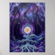 Mystical cosmic forest with swirling purple trees, a luminous hand holding a glowing white daisy flower above root-like light veins - dreamlike spiritual artwork.