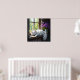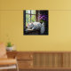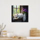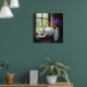 Add a relaxing vibe to your room with this pretty colorful poster featuring a white fluffy cat napping on a rustic window sill next to a pretty vase of vibrant purple flowers.