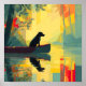 A black Labrador sitting peacefully in a canoe, surrounded by a warm, glowing landscape.