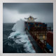 Image de haute qualité d'un grand cargo dans une tempête, avec des vagues puissantes qui s'écrasent contre sa coque et un ciel lourd et couvert.