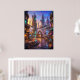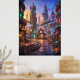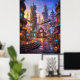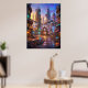 A vibrant alien city square glows under a radiant sunset, where warm golden light blends seamlessly with neon reflections of teal and magenta. Futuristic architecture rises in layered forms, with curved facades, suspended structures, and luminous details creating a rich urban environment. Empty streets and scattered objects suggest life beyond the frame, adding a sense of quiet narrative and atmosphere. Reflective surfaces and soft haze enhance the cinematic depth, making the scene feel alive and immersive. This artwork is perfect for modern interiors seeking bold color, futuristic design, and striking visual energy.